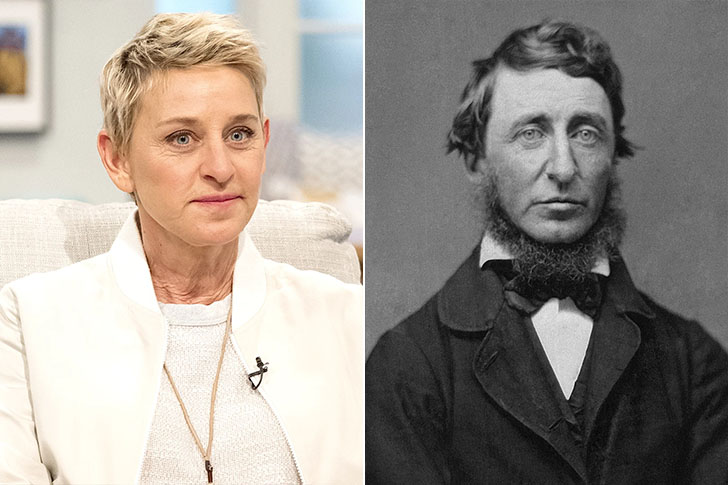 ¡Aquí tenemos a dos grandes! Tienen la misma mirada y la misma nariz pero no se parecen solo en eso. Son 2 genios. Henry David Thoreau vivió a principios del Siglo XIX, nació en 1817 y murió en 1862. Cambió el sentir y el pensar de su nación, Estados Unidos. Fue un filósofo, naturalista, escritor y poeta estadounidense. Es uno de los padres de la literatura de ese país. Ellen Lee DeGeneres es una presentadora de televisión estadounidense que lleva adelante el Ellen DeGeneres Show. Tiene una audiencia de millones de personas y ha ganado muchos Emmy. Tiene gran influencia entre su audiencia.